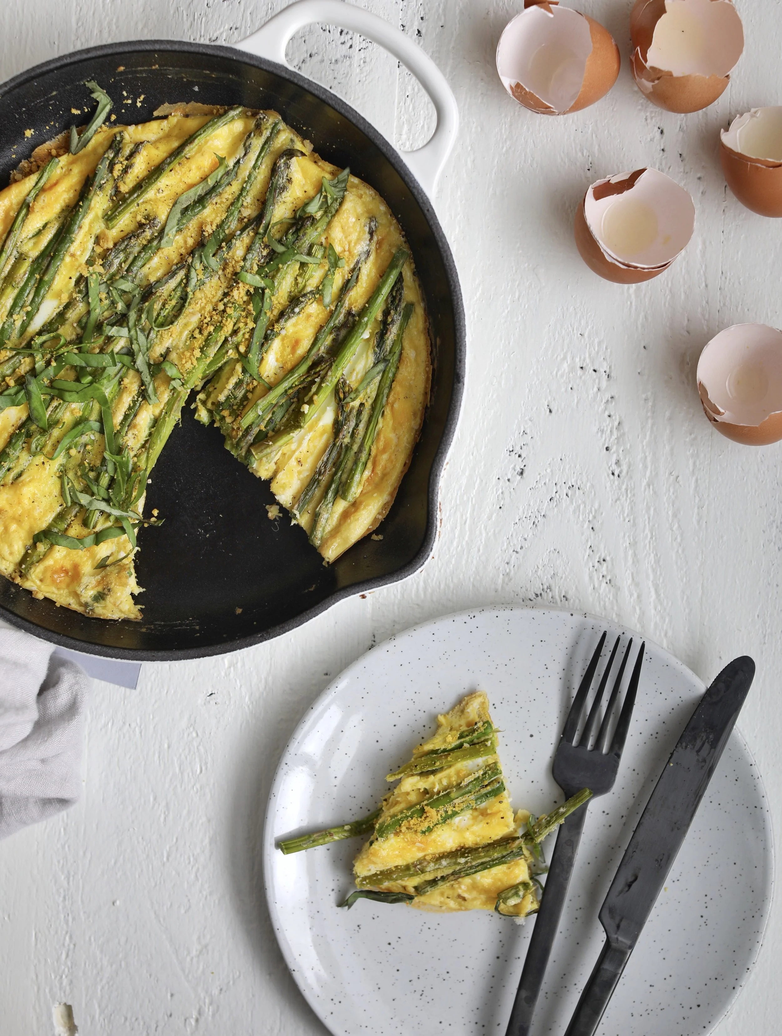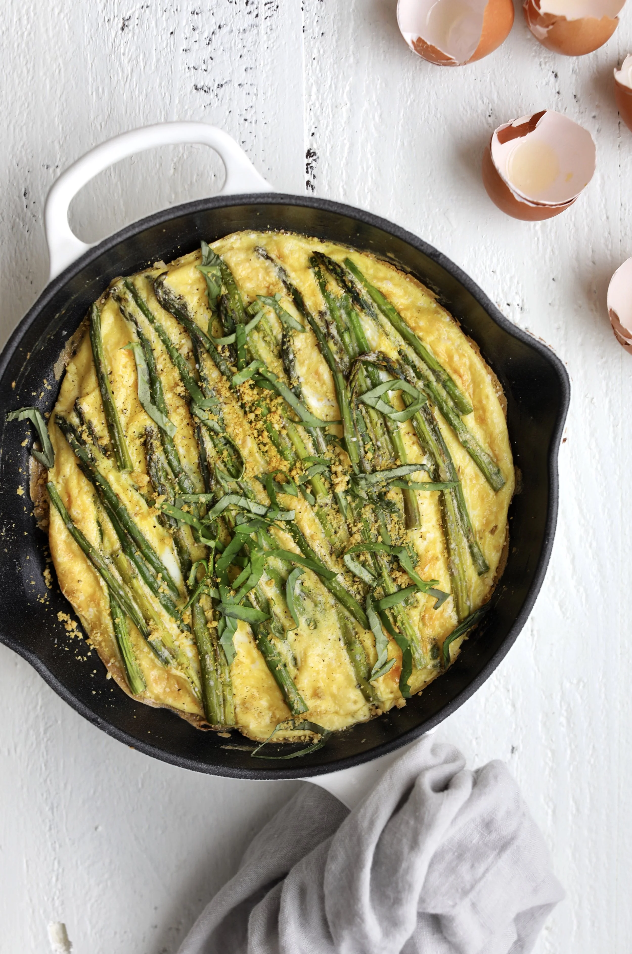 Place the cast iron skillet into the oven. Cook for 6 - 10 minutes until the middle is set. Slice and add additional seasonings like fresh herbs or cheese, enjoy warm or cold.